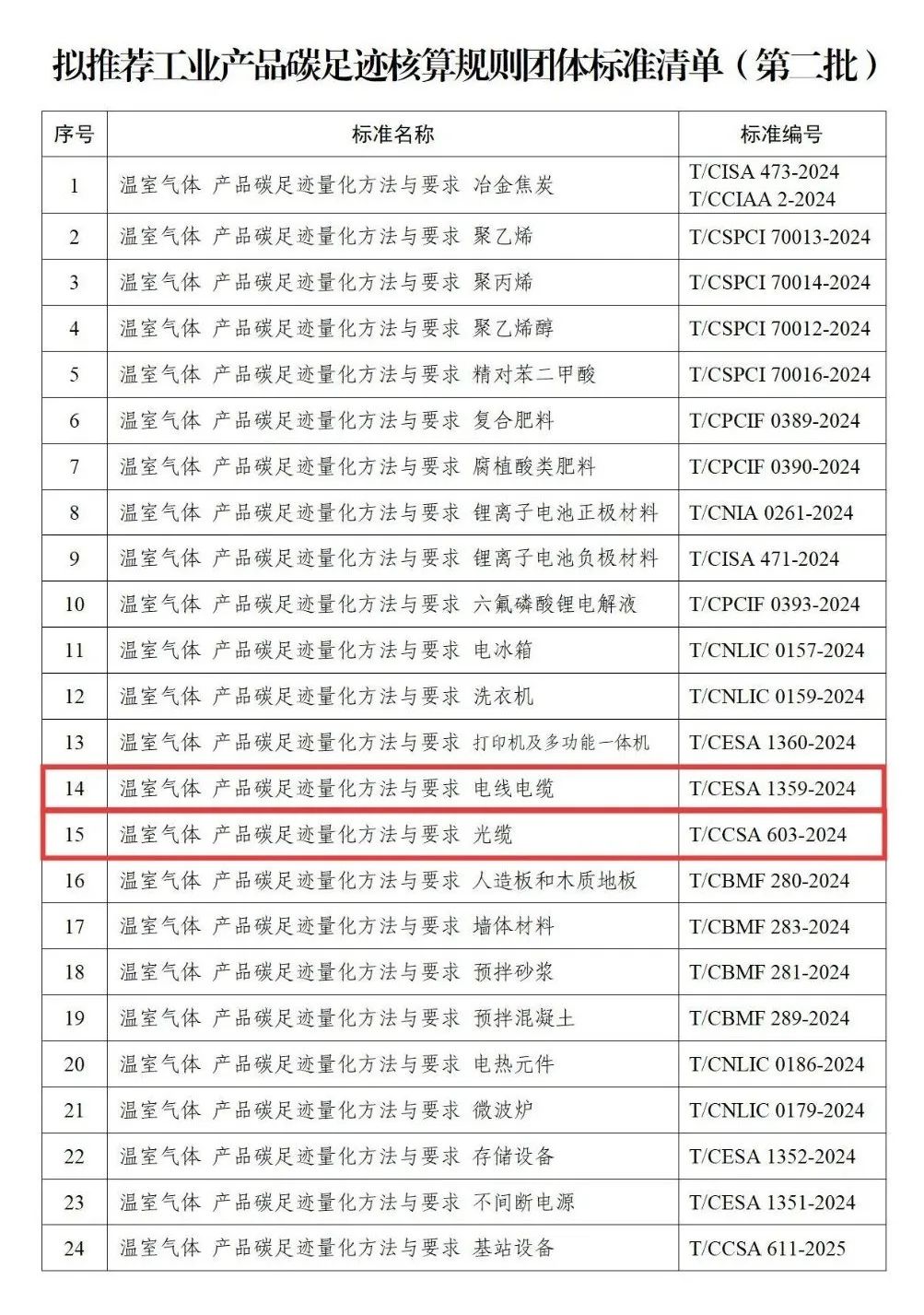 為落實(shí)國(guó)務(wù)院辦公廳《加快構(gòu)建碳排放雙控制度體系工作方案》(國(guó)辦發(fā)〔2024〕39號(hào)),支撐建立產(chǎn)品碳足跡管理體系,經(jīng)相關(guān)標(biāo)準(zhǔn)化機(jī)構(gòu)推薦、專家評(píng)審等程序,形成擬推薦工業(yè)產(chǎn)品碳足跡核算規(guī)則團(tuán)體標(biāo)準(zhǔn)清單(第二批),現(xiàn)予以公示。其中2項(xiàng)與線纜有關(guān),詳情見(jiàn)下表。